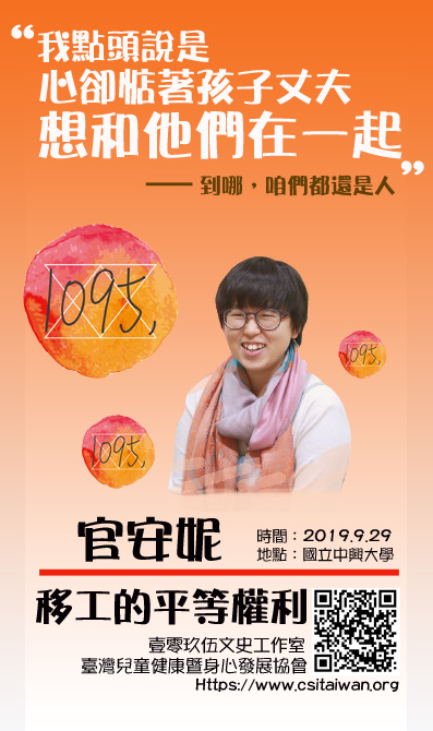 如果有時間,也歡迎參加2019.09.29於中興大學,非營利組織1095創辦人官安妮小姐分享移工的故事,打破我們與移工朋友們間一堵無形牆。