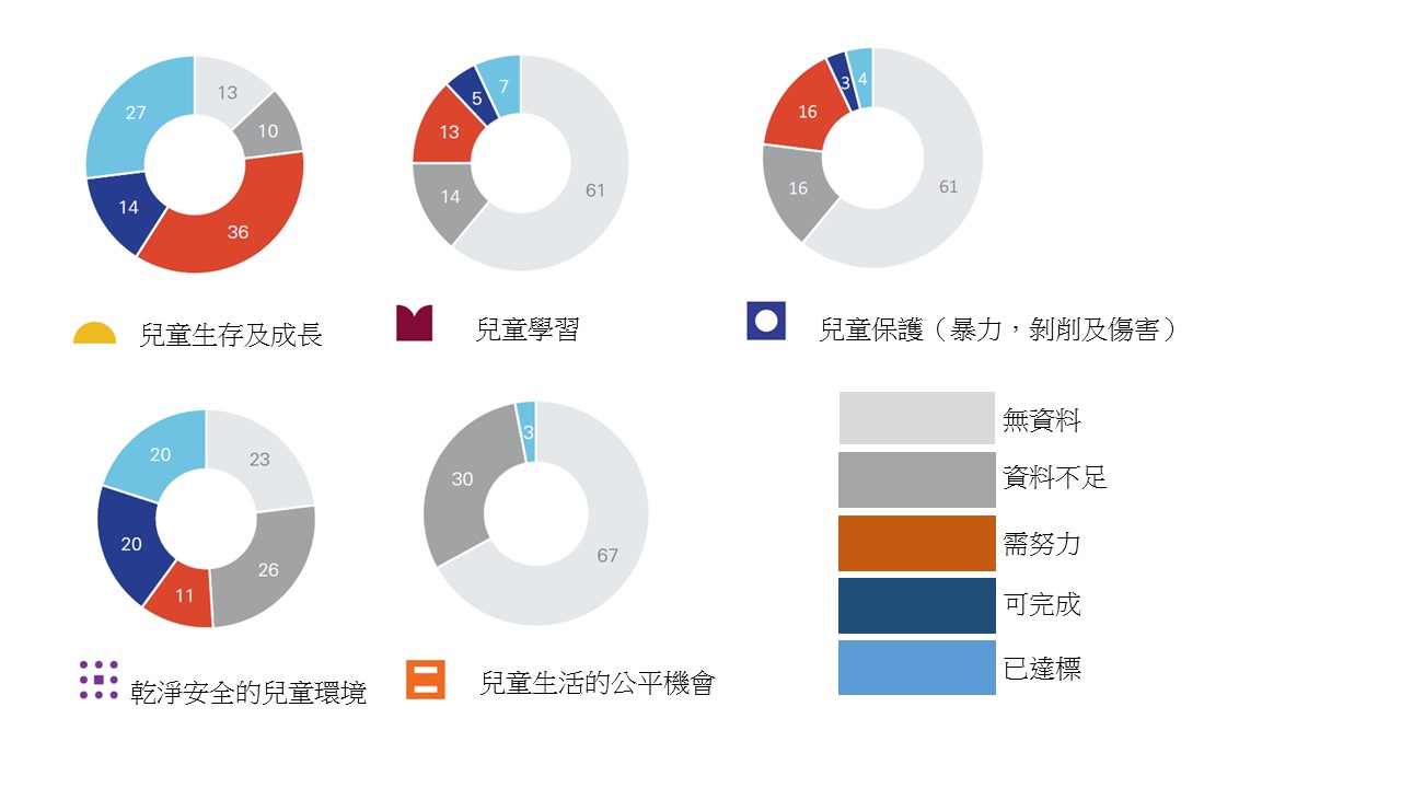 那有關兒童永續的五面項目前的完成度如何 ? 從全球整體來看,除了兒童生存及成長面項外,其餘4面項都有嚴重資料不足的情形。兒童保護及兒童生活的公平機會是目前離永續最遠的面項 (圖3)。