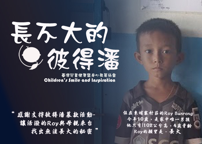 2019.10.16-10.23 彼得潘Roy、她的母親和KAKO阿詹老師抵台至彰化基督教兒童醫院住院進行生長激素分泌刺激及腦部磁核共振的相關檢查。最後確定生長發育停留在4歲的原因是因為腦下垂體發育不良所導致的「生長激素缺乏」。這樣疾病的發生率是每4000至10000個兒童中就有一位。Roy Bunrong在2019.10.21號開始每日注射生長激素,我們也持續紀錄他的生長狀況。2021.04.經過17個月的治療,Roy已由4歲半兒童成長到8歲6個月的狀況。