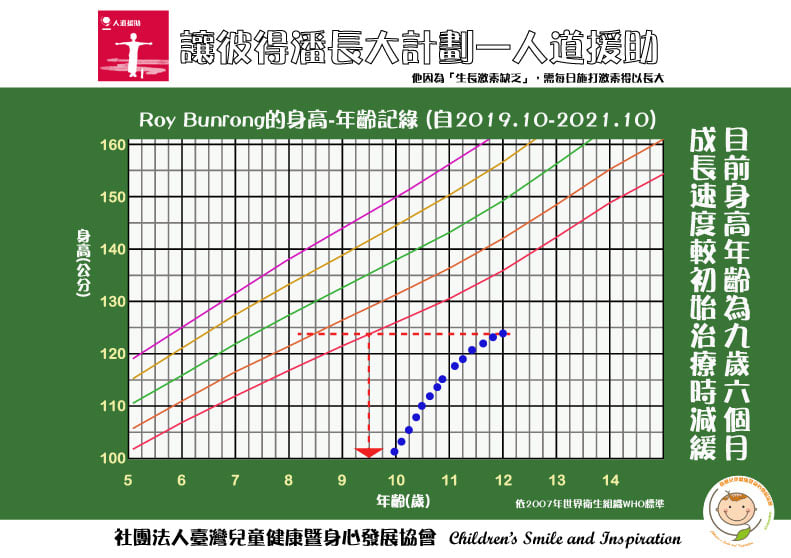 2021.10月,11歲9個月大的Roy Bunrong 二年來從四歲兒童的身高已成長到九歲半(九歲半兒童的第三百分位)。然而我們發現Roy 生長的速度有變慢了,請教兒童內分泌科醫師後瞭解這是生長激素施打治療時會有的現象。要協助生長此時需有更好的營養支持。